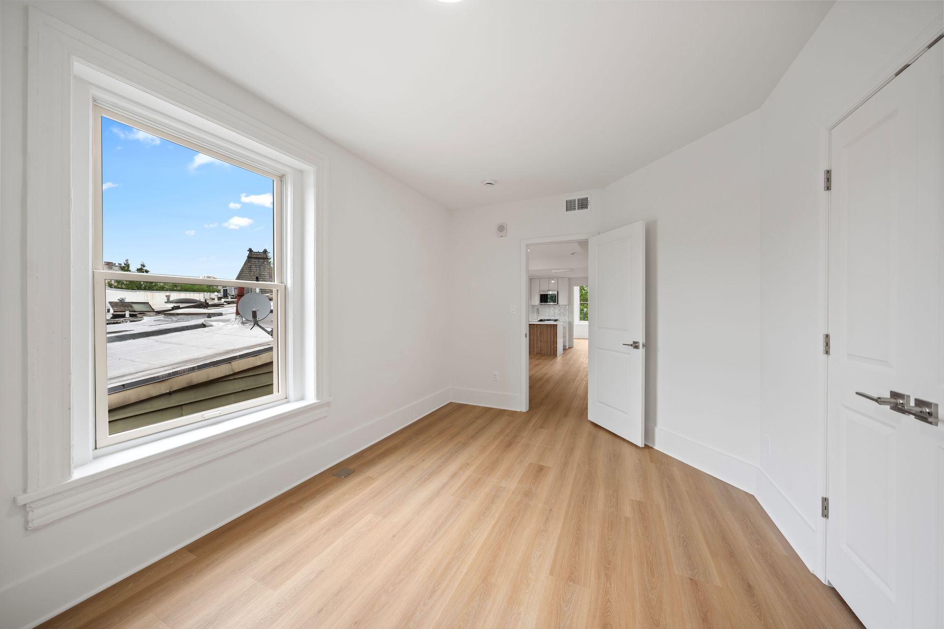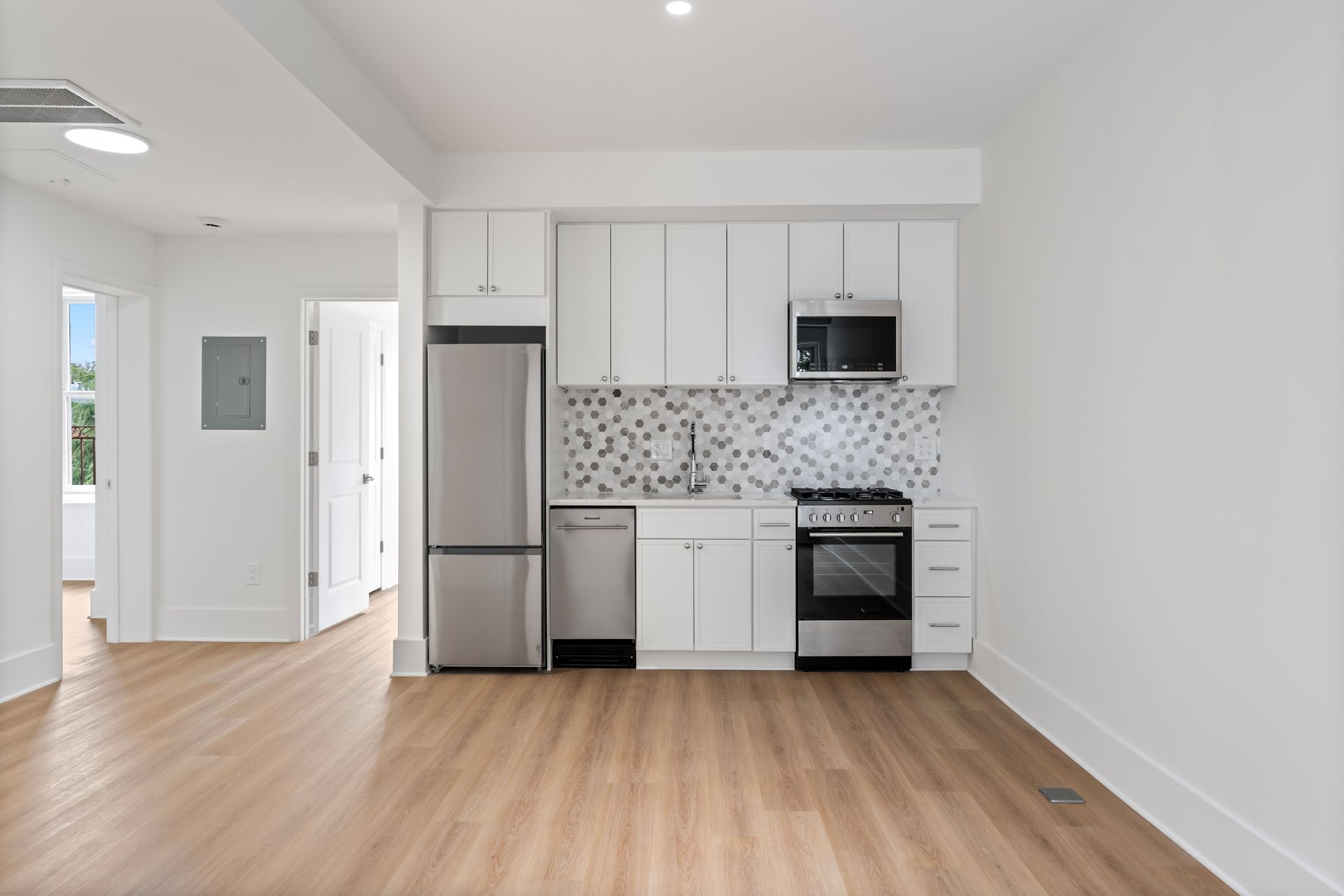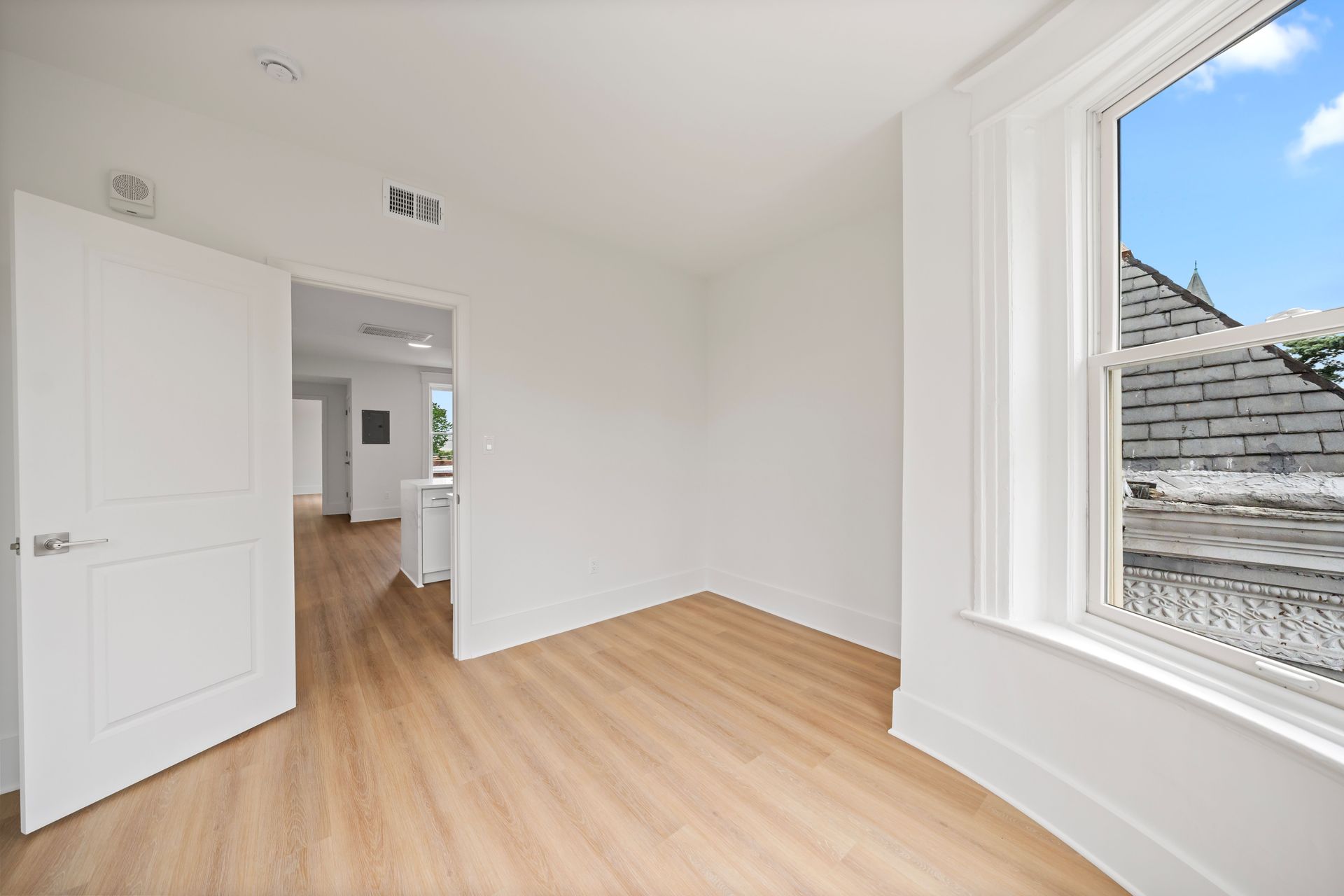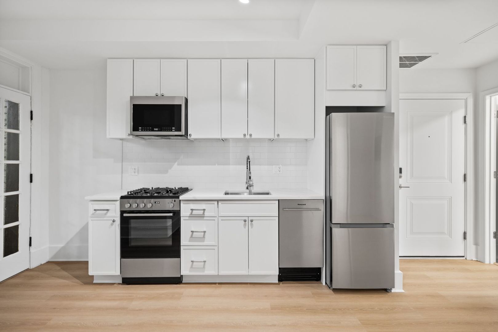 Inside, every detail reflects quality and care. The building features brand-new electric wiring throughout and all-new plumbing systems from the slab to the street, along with ducted central HVAC and individual thermostats in each unit. Kitchens are outfitted with painted wood cabinetry with soft-close drawers and doors, Calacatta Laza Quartz countertops, and a full suite of stainless-steel appliances. Additional interior finishes include custom tile backsplashes, brand-new wood-look flooring, and Carrara large format tile showers with Delta chrome fixtures and frameless glass shower doors. Rear-facing units feature walk-out decks, while two brand-new central laundry facilities serve the building for added convenience. Entry is modern and secure with the ButterflyMX smart system, allowing remote access for visitors and deliveries via phone or keypad.